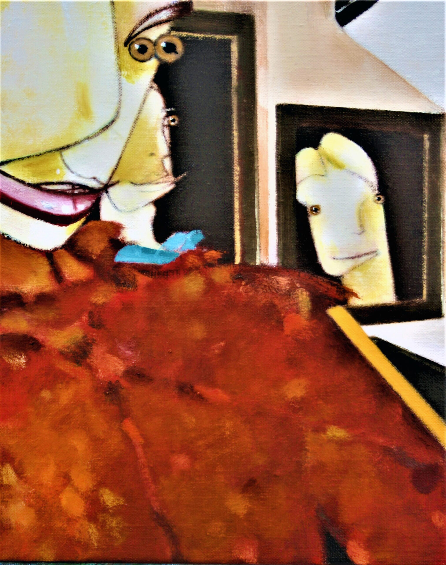 Mrs Sheldon with August Ames lips, 2023. Oil on canvas, 35×30 cm