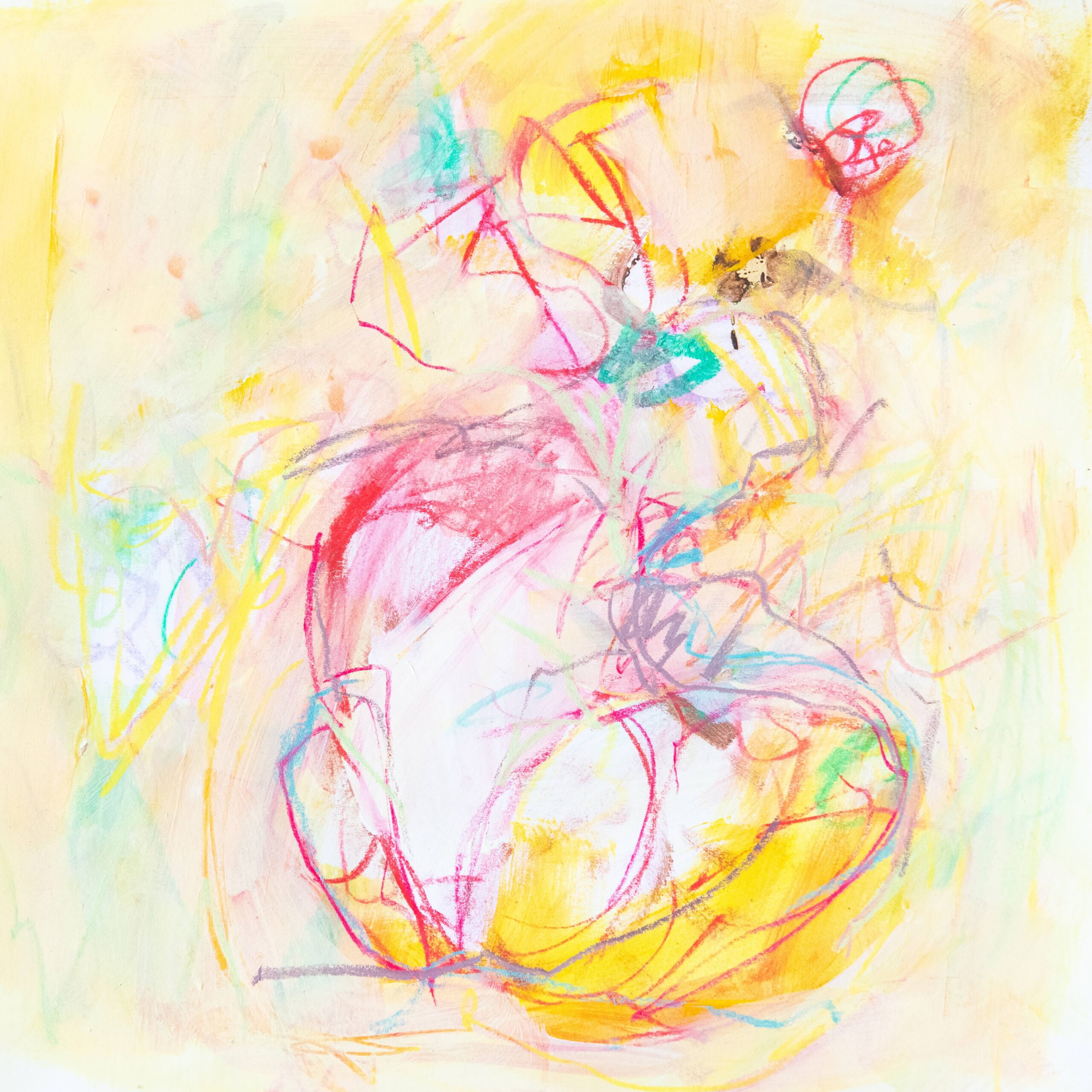 Dreaming…Living…, 2025. Acrylic, oil pastel, watercolour on cotton paper, 57×76 cm