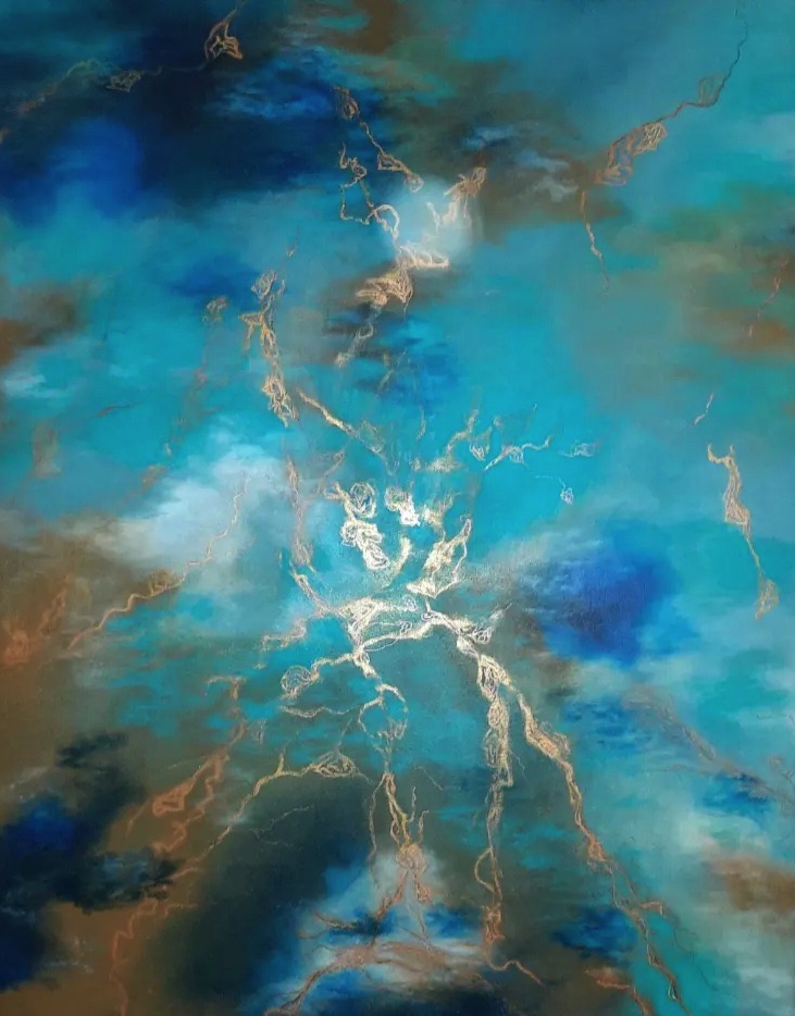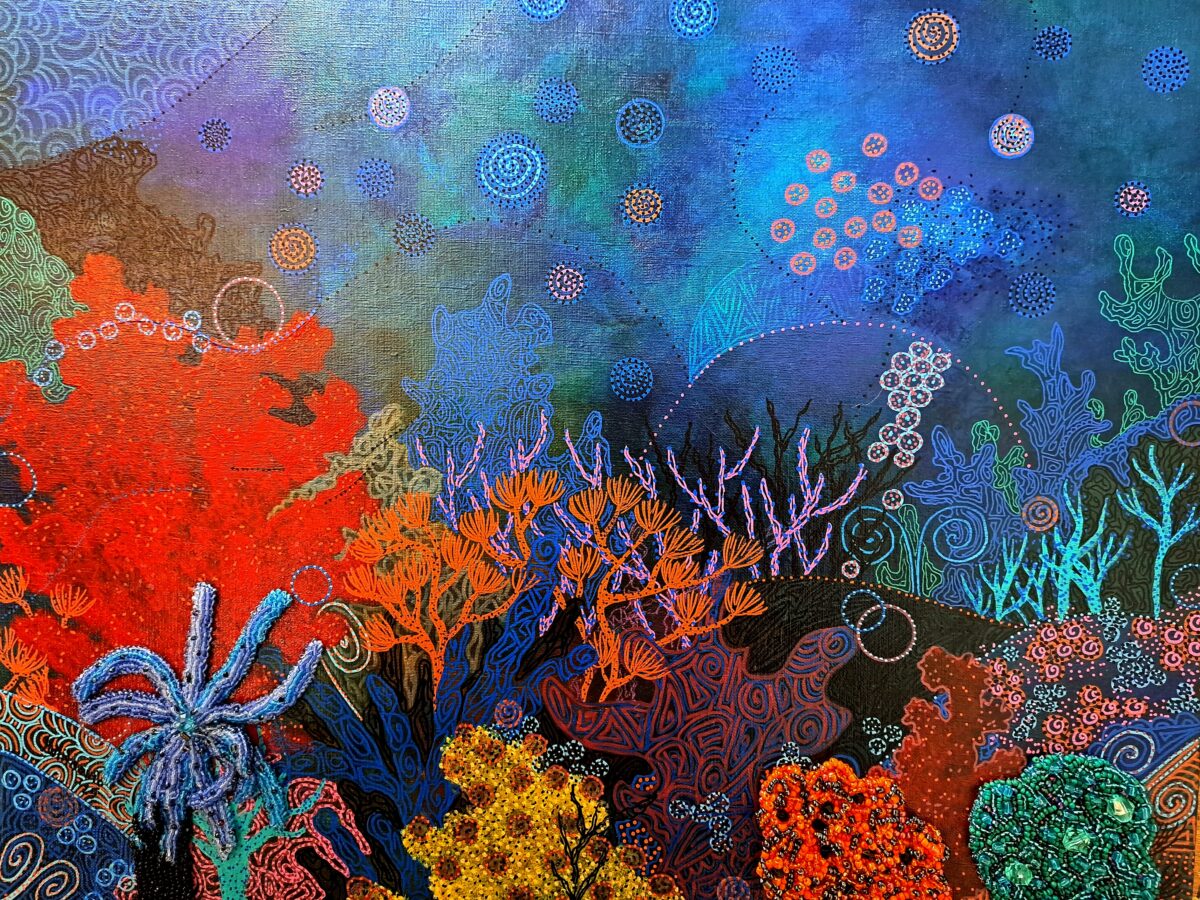 Depth, 2025. Acrylic painting and bead embroidery on linen canvas, 40×50 cm